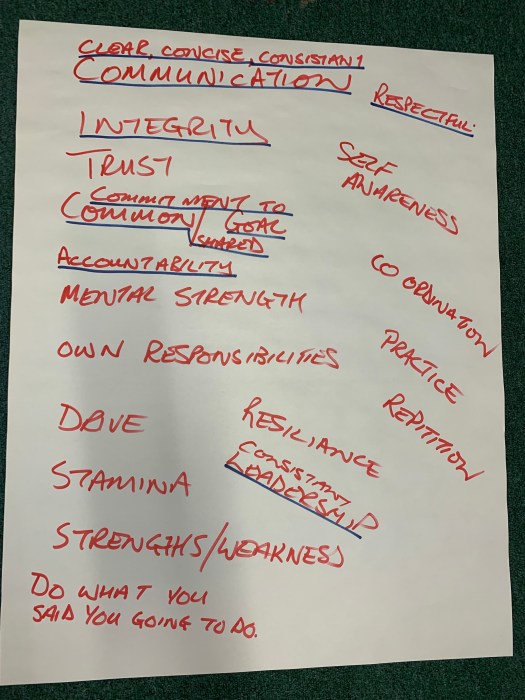We made our way back into the hut for some further Belbin discussions, and how what we’d learned about our team roles could play a part us being a winning team – what did we see as the most important behaviours to being a winning team?