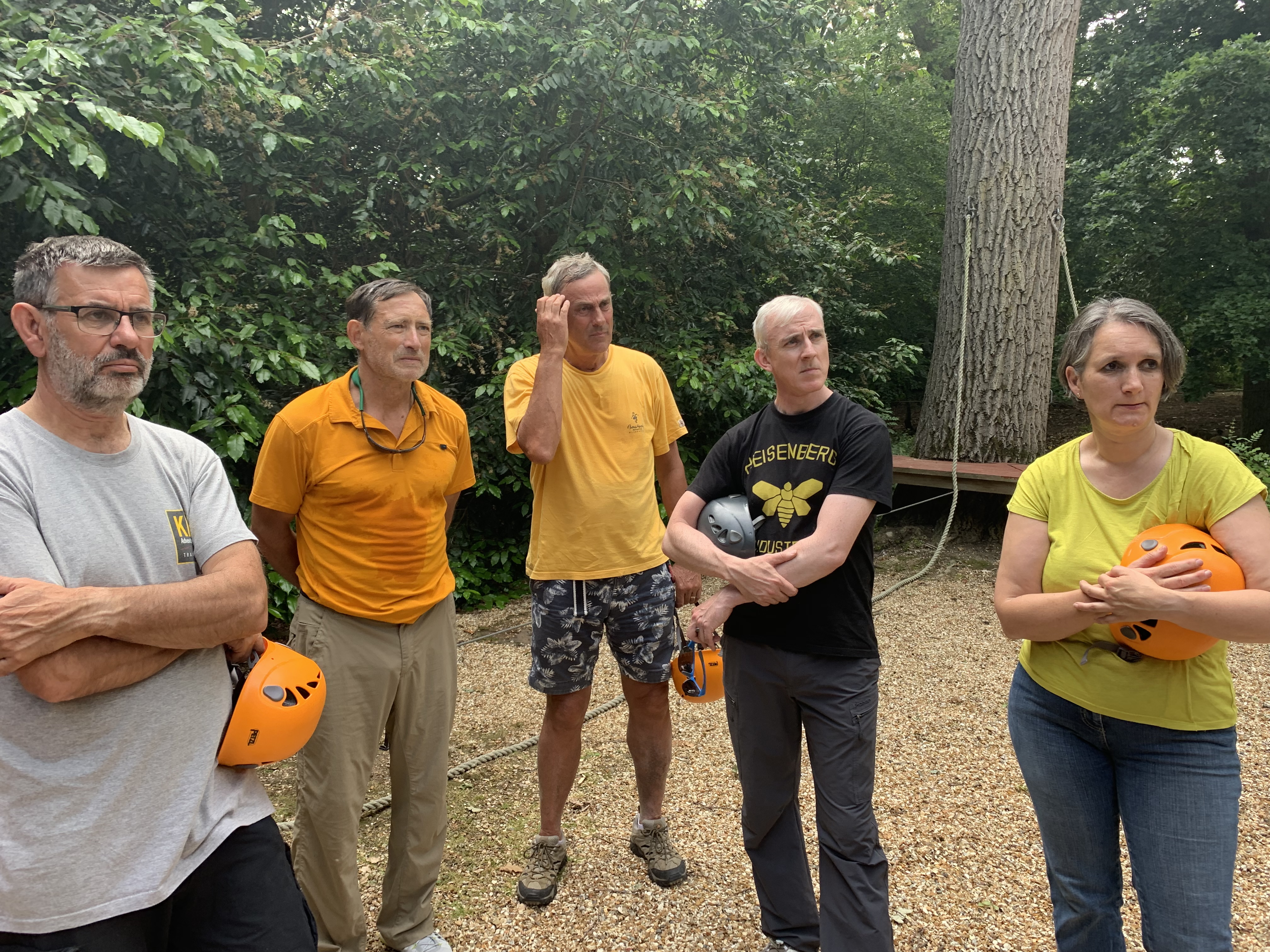 The next activity was the Mohawk Walk – as a team (crew!) we eyed up the task ahead of us, and (I suspect) individually (in our own minds) started to figure out how we could get all the way round the course, without touching the floor. Little did we know, we’d have a time limit (40mins) and an extra difficulty – getting a bell around too, and without it ringing!!! So once we’d spent a few minutes having the rules clarified, we quickly (this would be the only thing we would do quickly!!!!) jumped onto the starting platform. With all of the crew now on the platform and ready to make our way, 1 by 1 across the first wire, we appeared to deliberate for what seemed like an eternity. I was at the back of the platform and fighting every urge to issue some instructions, or at least, to get someone – anyone, to take a first step. Alas, finally the first crew member reached the first platform, and promptly ushered the next to join him. The next dilemma was, do we send them further ahead down the course, or do we try and stick together. Of the total 40 mins, I’m guessing we took around 15/20 to get half of the crew to the first main tree (platform 2). By this time, I was no longer able to keep quiet, with those closest to me certainly hearing my frustration at our team’s over-thinking of everything, and our collective reluctance to take a (small) risk.