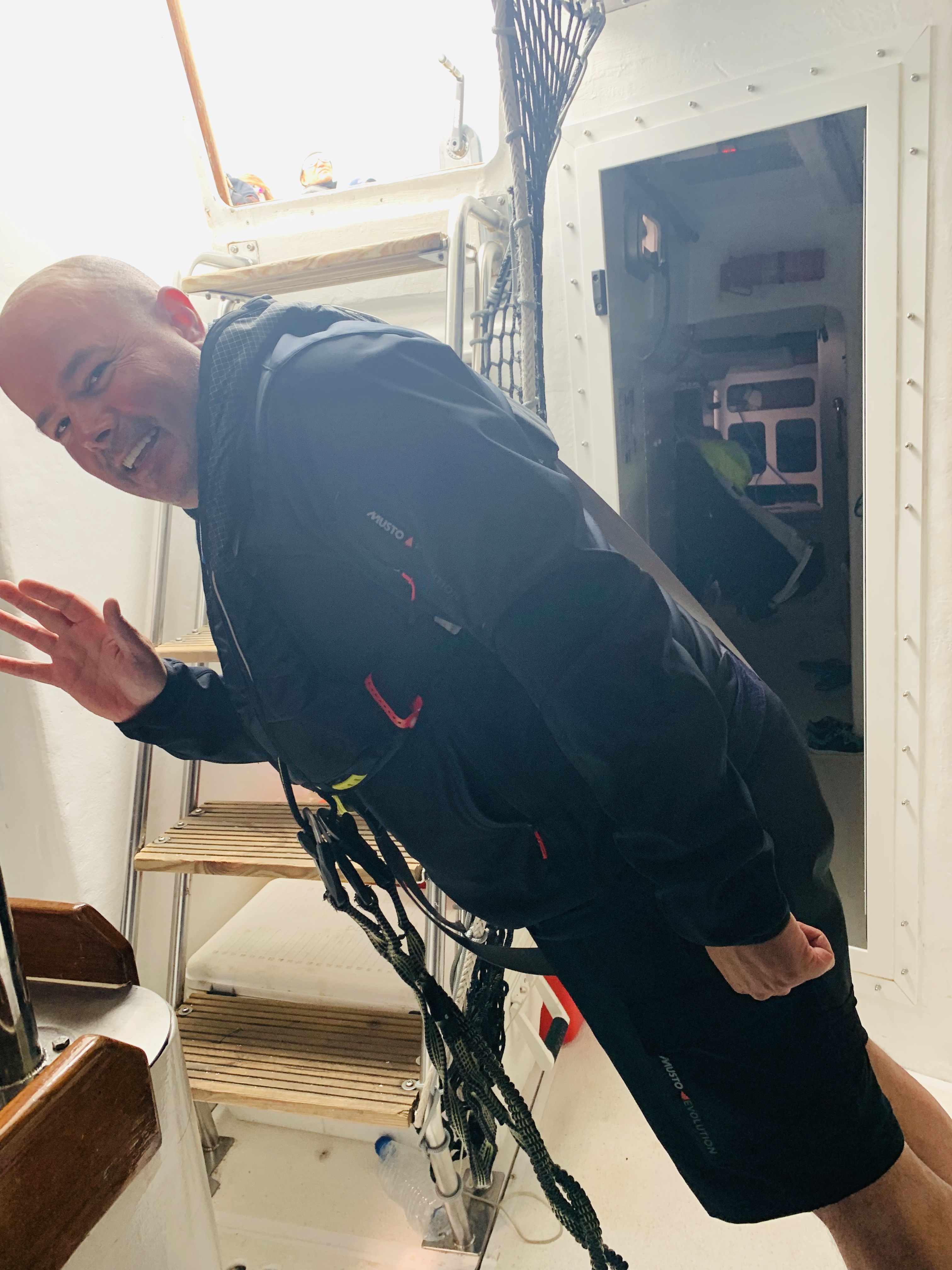 We woke from our sleep, and with support needed during the standby watch, made our way on deck to help out with a sail change. Following which, I was able to get a bit more rest. When it came to being back on watch, and on day break, we were in the middle of the pack, having made a choice to chase where we thought might be wind. It was a very tranquil day – not ideal conditions for a sailing race!!