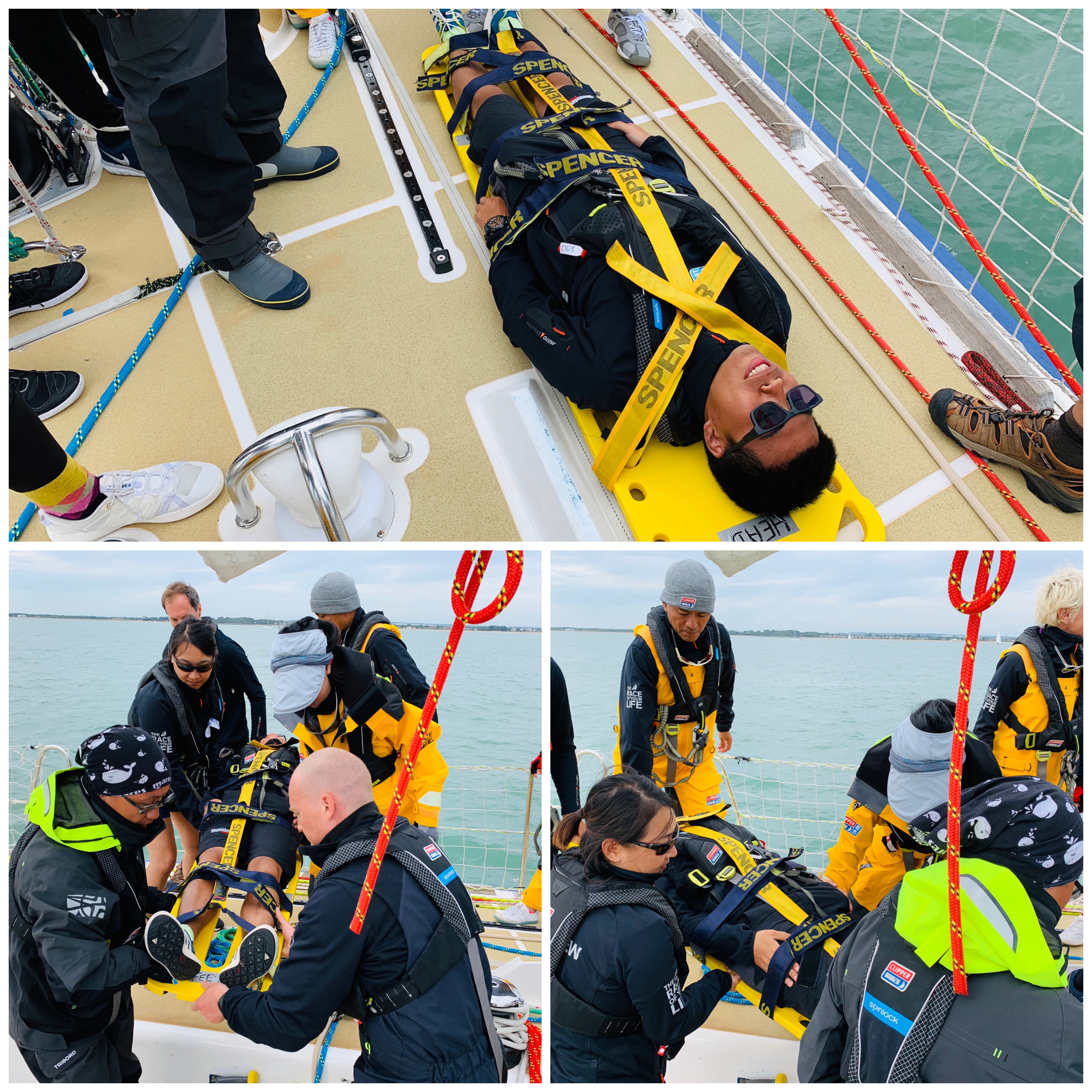 The next task was to get the spinal board out (once we had a willing volunteer). It was surprisingly easy to get him attached in the right way, and to carry him from the foredeck to below deck. Thankfully we didn’t drop our patient, and he made a full recovery (from his imaginary life threatening injuries) once we’d made him some food! Hopefully this is another one of those safety things we’ll never actually have to put to use in real life!